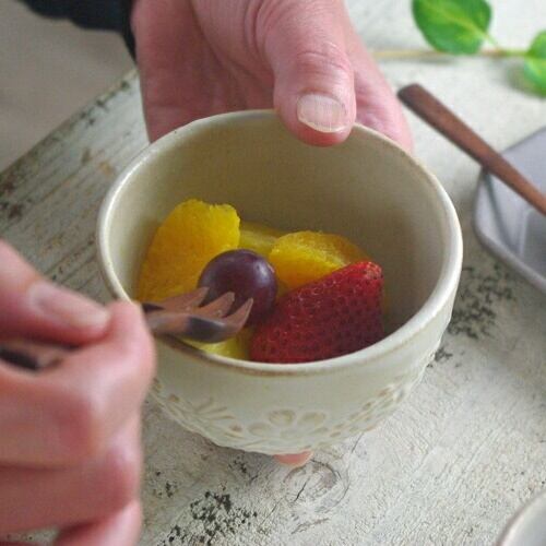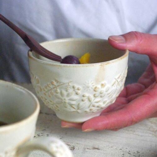 ぽってりしたお花のレリーフ模様がかわいい、北欧風のミニカップです。