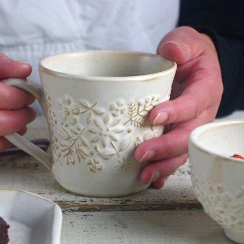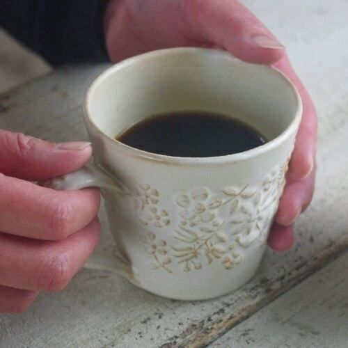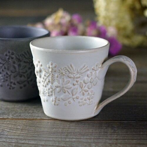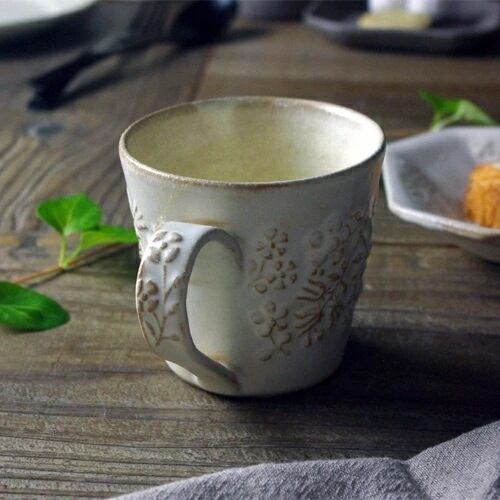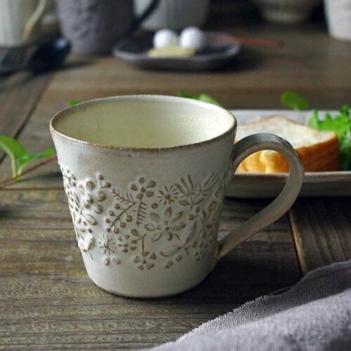 北欧風の花柄がかわいい益子焼のマグです。